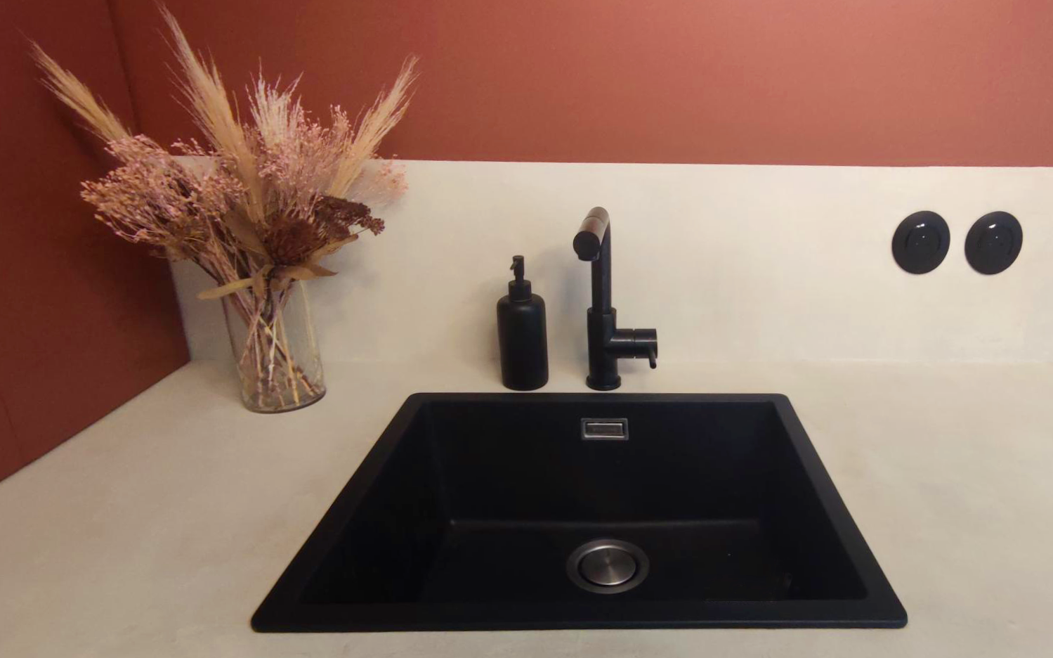 Les robinets, vasque, poignées de portes, interrupteurs et prises sont en finitions noir mat et c’est la petite touche qu’on adore!