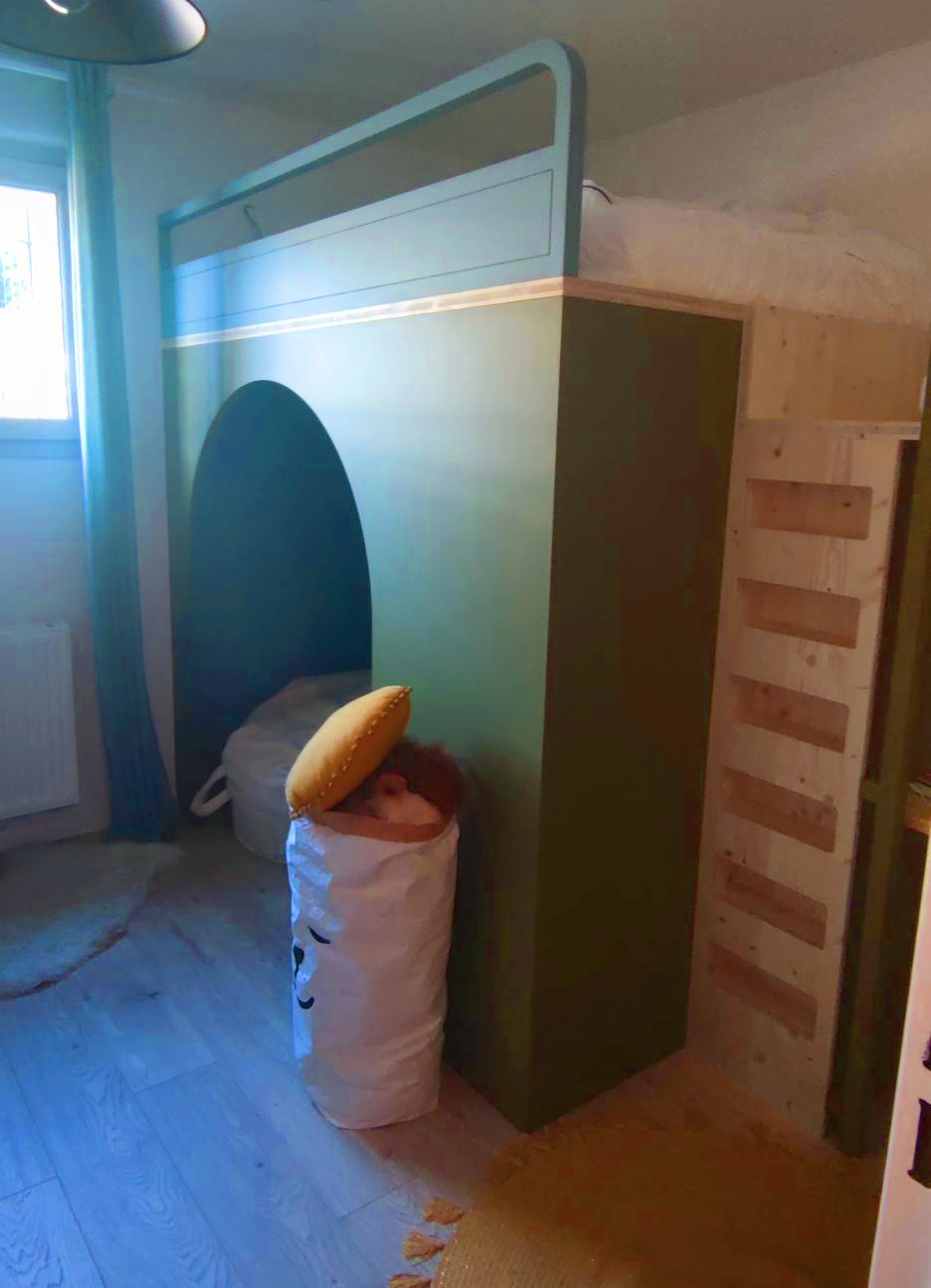 Dans la chambre pour enfant on a dessiné un lit surélevé sur mesure! Sous le lit des rangements encastrés et la possibilité de se glisser dessous. A droite du lit un espace pour se détendre et en dessous un bureau avec des rangements encastrés. On a optimisé les recoins pour avoir le maximum de rangements.