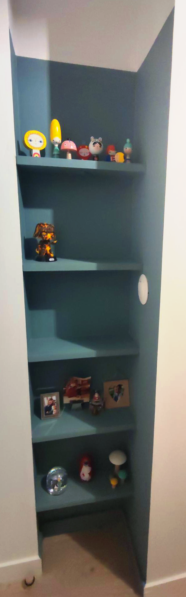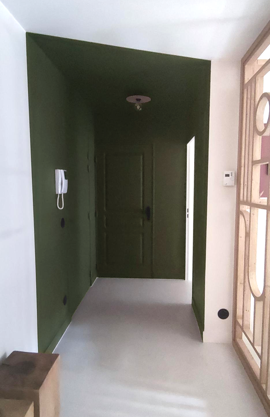 Pour marquer l’entrée et créer un dynamisme au niveau de cet espace nous avons opter pour une peinture vert sauge, l’idée était de créer une « boite » nous avons donc repris cette peinture sur le plafond et créer une profondeur en jouant sur une application de biais.