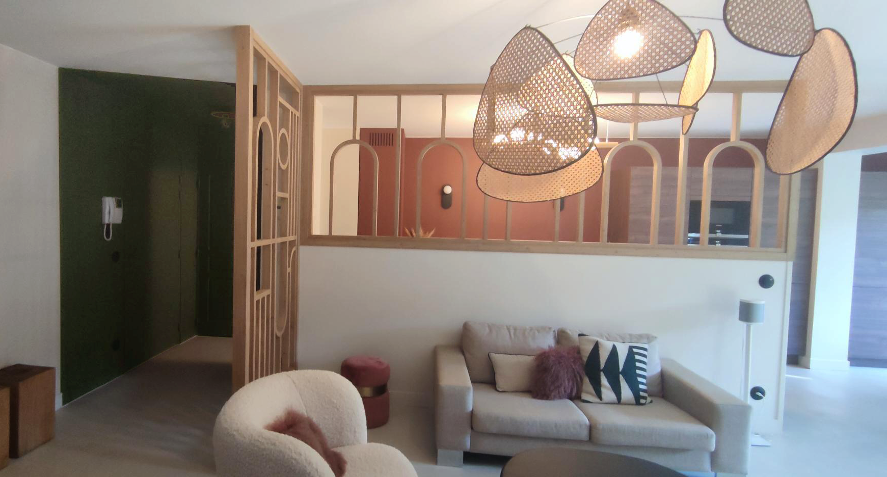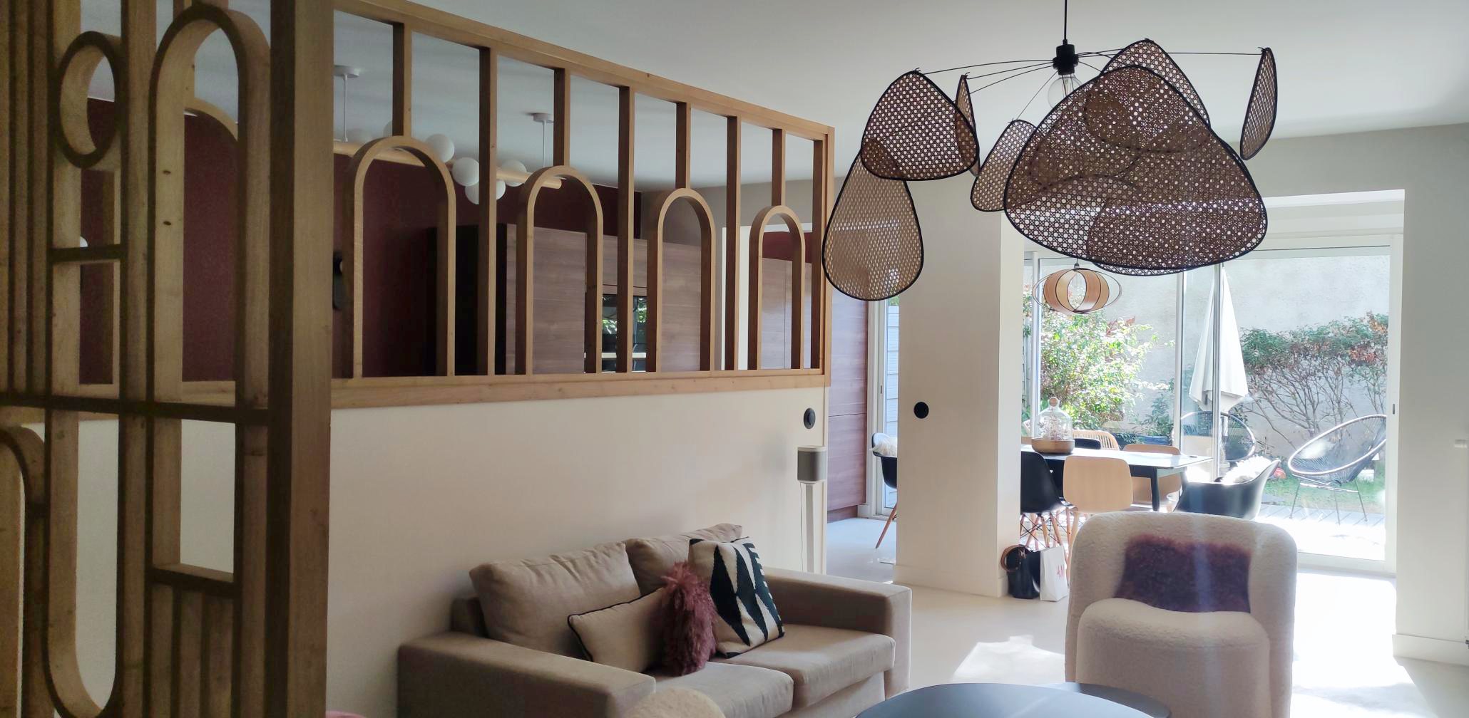 La cloison entre la cuisine et le salon a été modifiée. Nous avons créé une verrière pour séparer les deux espaces. Pour le sol nous avons opté pour du béton ciré. Pour séparer l’entrée de la pièce de vie nous avons dessiné et créé un claustra qui reprend l’esthétique de la verrière.