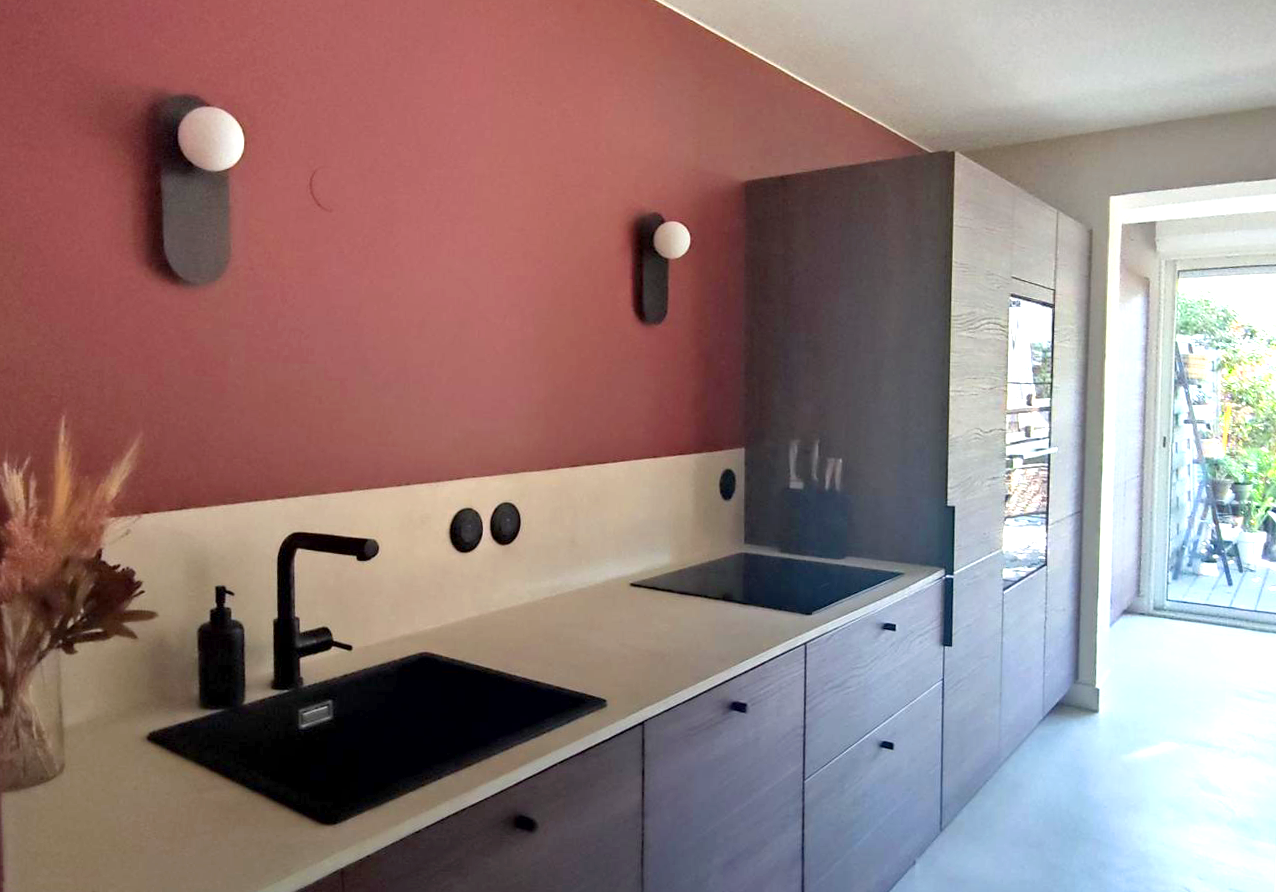 Les meubles de la cuisine sont en finition noyer et le mur peint en vieux rose. Le sol, les plans de travail et les crédences sont en béton ciré clair.