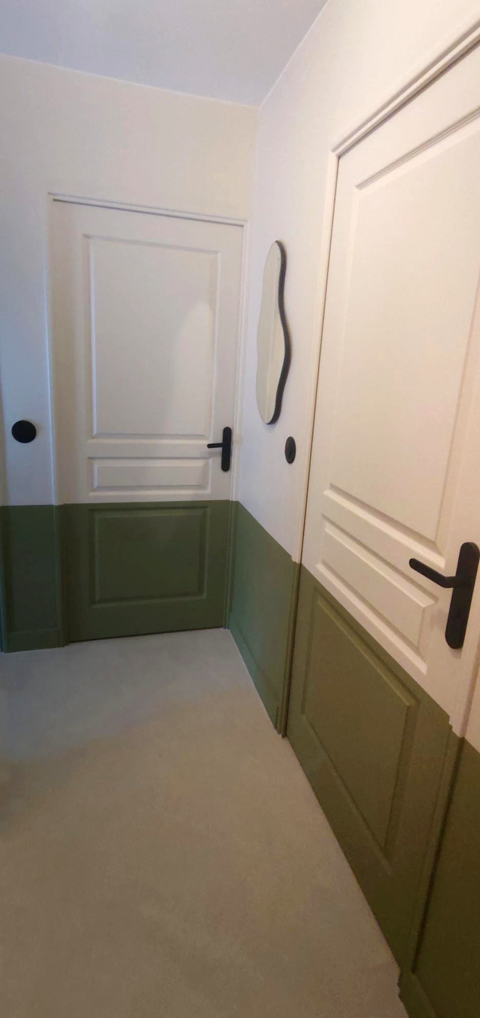 Dans le couloir qui donne accès au coin nuit, les chambres, le bureau et la salle de bain, on a créé une séparation visuelle avec le soubassement peint en vert sauge. Pour le sol on le béton ciré de sorte à avoir une continuité dans tout l’espace.
