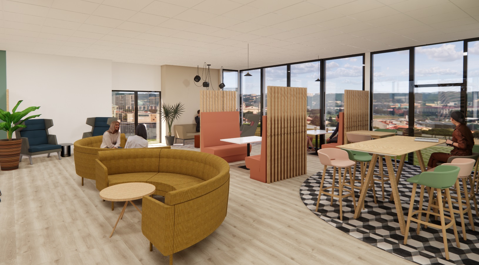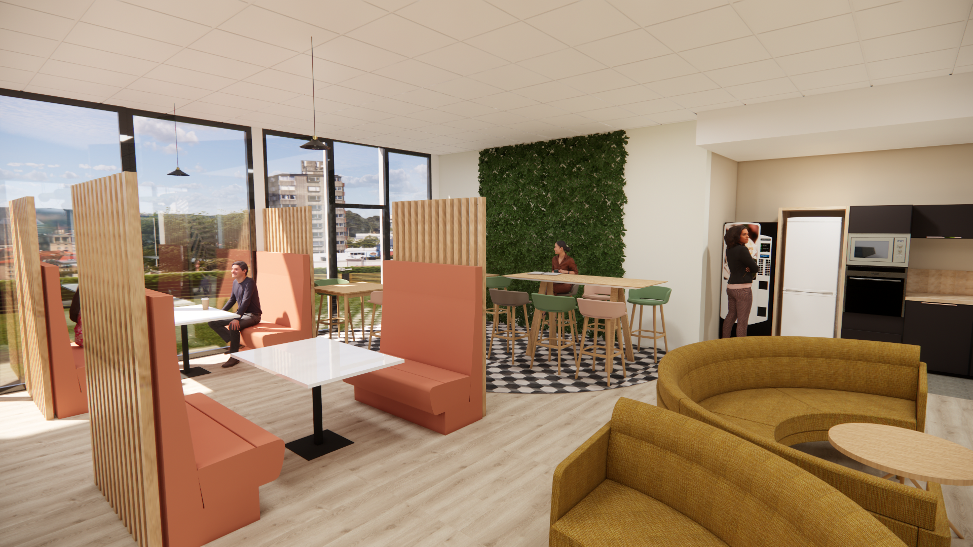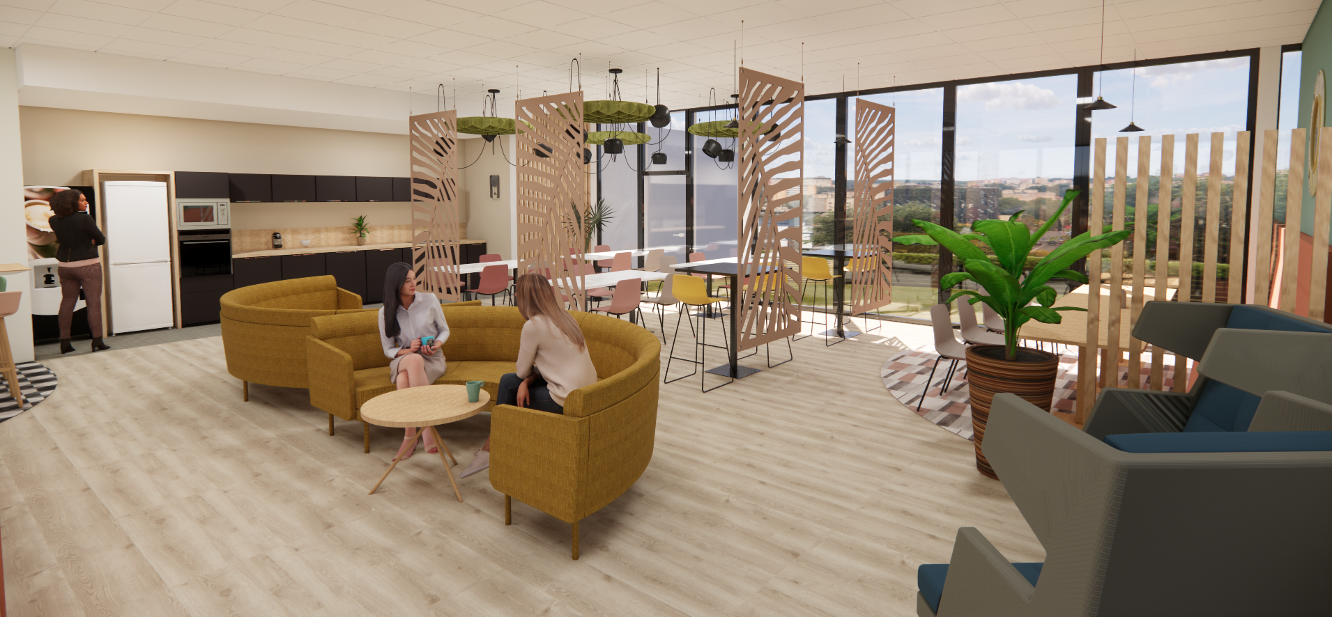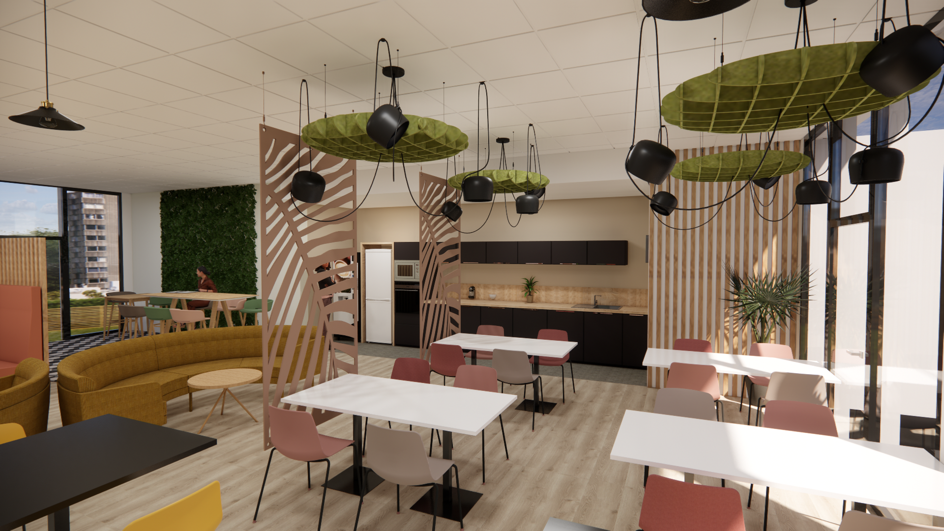 Le but ici était de créer un réfectoire d’entreprise fonctionnel et accueillant. Le cahier des charges est assez simple, créer un espace convivial dans lequel on a un espace cuisine, des zones de restauration et de détente.