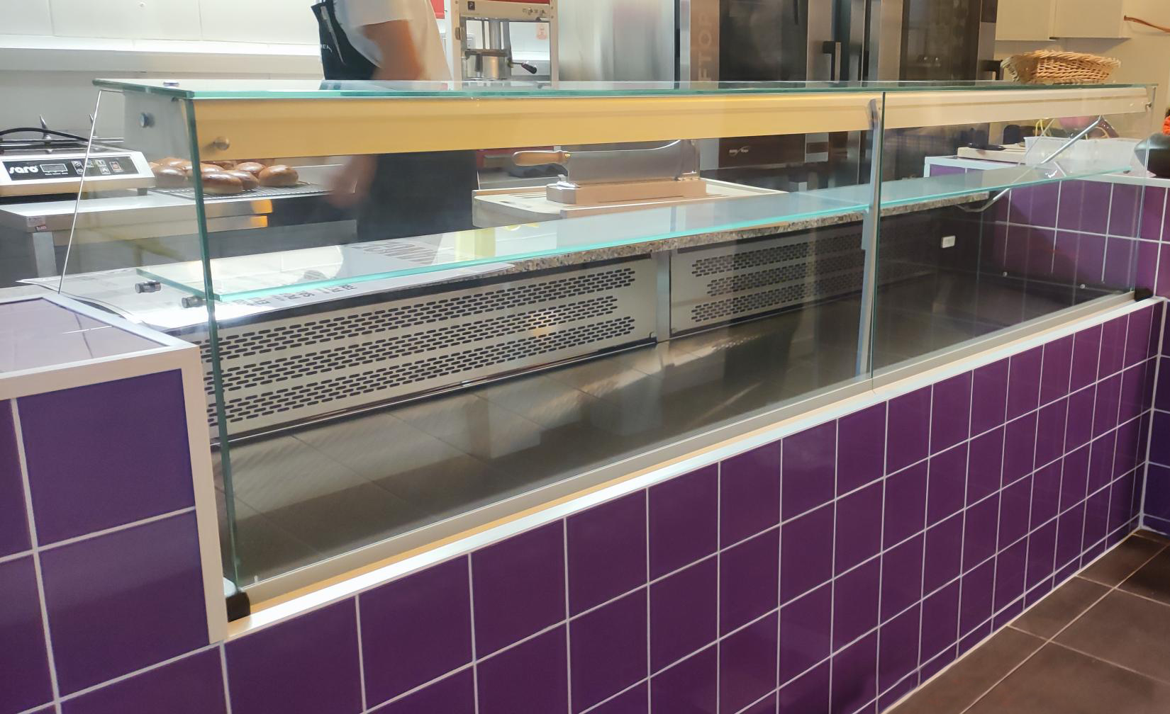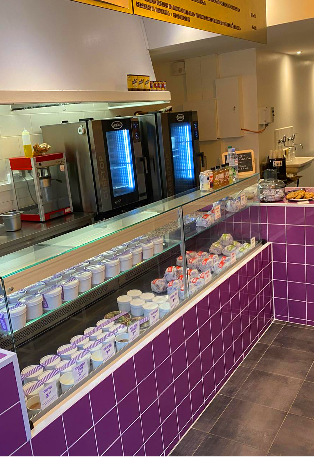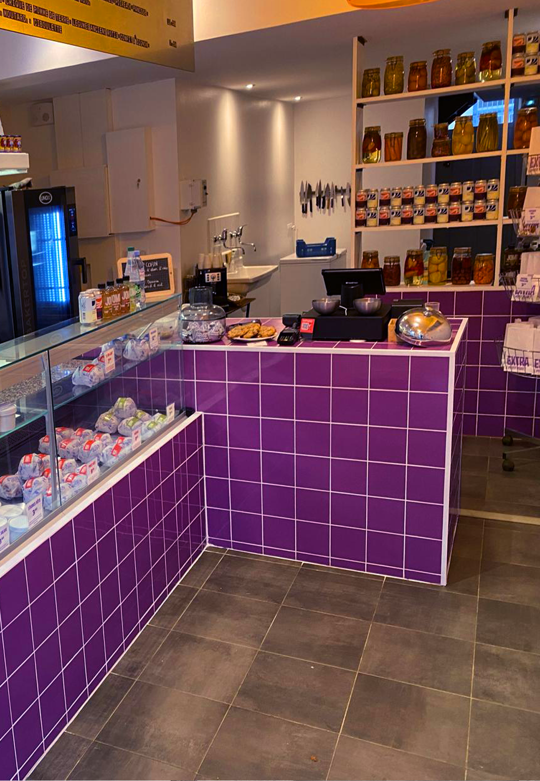 Pour coller au concept et à la charte graphique de l’enseigne nous avons pris le parti d’un carrelage violet 15cm x15cm qui donne toute l’identité à cet espace de restauration.